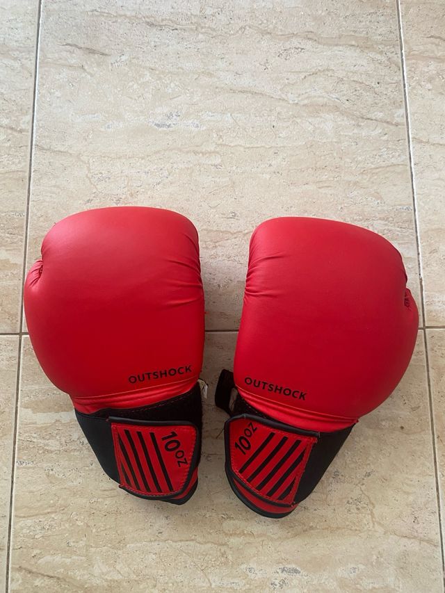 Par de guantes de boxeo de la marca OutShock en color rojo. - Talla 10oz. - Cierre de velcro. - Diseño con líneas negras.