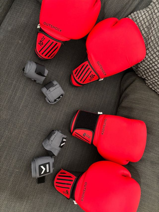 Detalles del productoSet de guantes de boxeo Outshock en color rojo. Incluye un par de 8oz y un par de 10oz, además de vendas. 1 par - 10€, 2 pares 15€