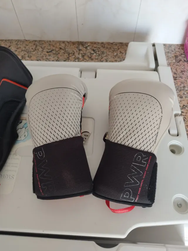 Par de guantes de boxeo de la marca Decathlon. - Color gris claro con detalles en negro. - Cierre de velcro en la muñeca. - Diseño con perforaciones para ventilación.