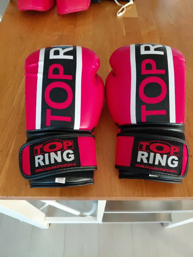 Par de guantes de boxeo de la marca Top Ring en color rosa. - Diseño con franjas blancas y negras. - Cierre de velcro en la muñeca. - Logo de la marca visible.