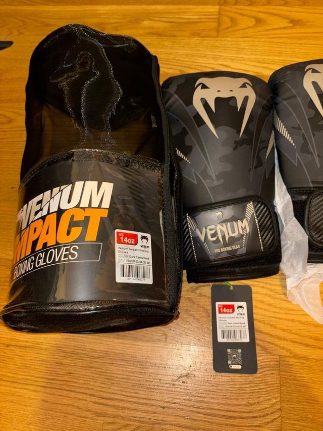 Guantes de boxeo Venum Impact en color Dark Camo-Sand. - Talla 14oz. - Incluyen bolsa de transporte. - Diseño de camuflaje.