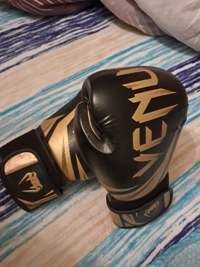 Guantes de boxeo de la marca VENUM en color negro con detalles dorados. - Diseño con logo VENUM. - Cierre de velcro. - Acabado en piel sintética.