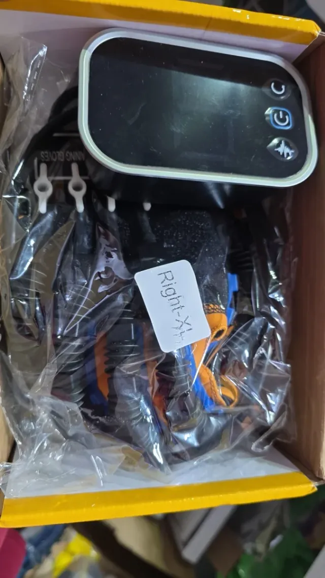 Detalles del productoGuantes de entrenamiento para la mano derecha, talla XL. Incluyen un dispositivo con pantalla y botones.