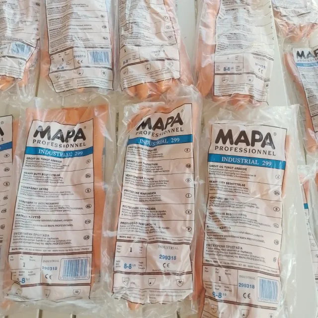 Detalles del productoSe venden 25 pares de guantes de goma MAPA Profesional, modelo industrial 299.Se venden por Packs de 5 pares a 2€ el par de guantes.