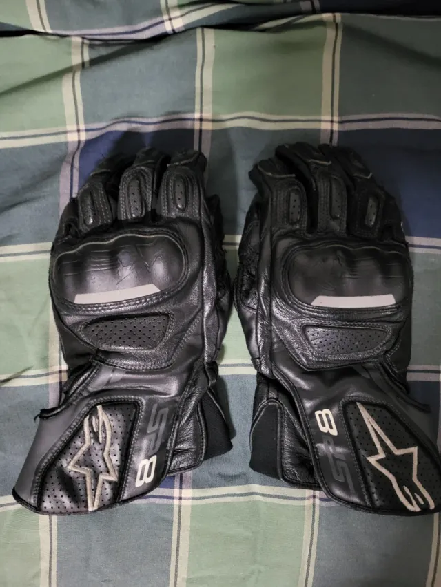 Par de guantes de moto de cuero negro, marca Alpinestars. - Diseño con protecciones. - Perforaciones para ventilación. - Detalles reflectantes. Talla L