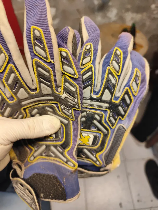 Guantes de moto con protecciones. - Diseño en color morado, blanco y negro. - Detalles en amarillo. - Cierre de velcro en la muñeca.