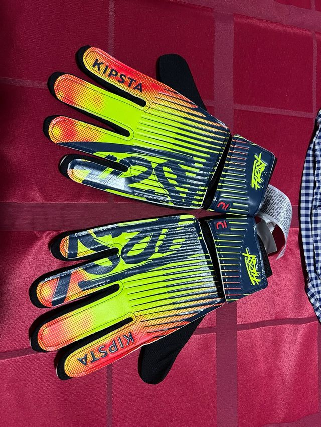 Guantes de portero Kipsta con un diseño llamativo en amarillo, naranja y azul. - Marca: Kipsta - Talla: 10 - Diseño degradado con detalles de líneas.