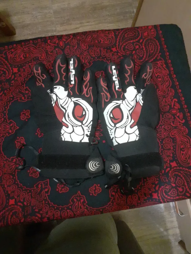 Guantes de snowboard de la marca Level con un diseño llamativo. - Color negro con detalles en rojo y blanco. - Cierre de velcro en la muñeca. - Cordones de ajuste.