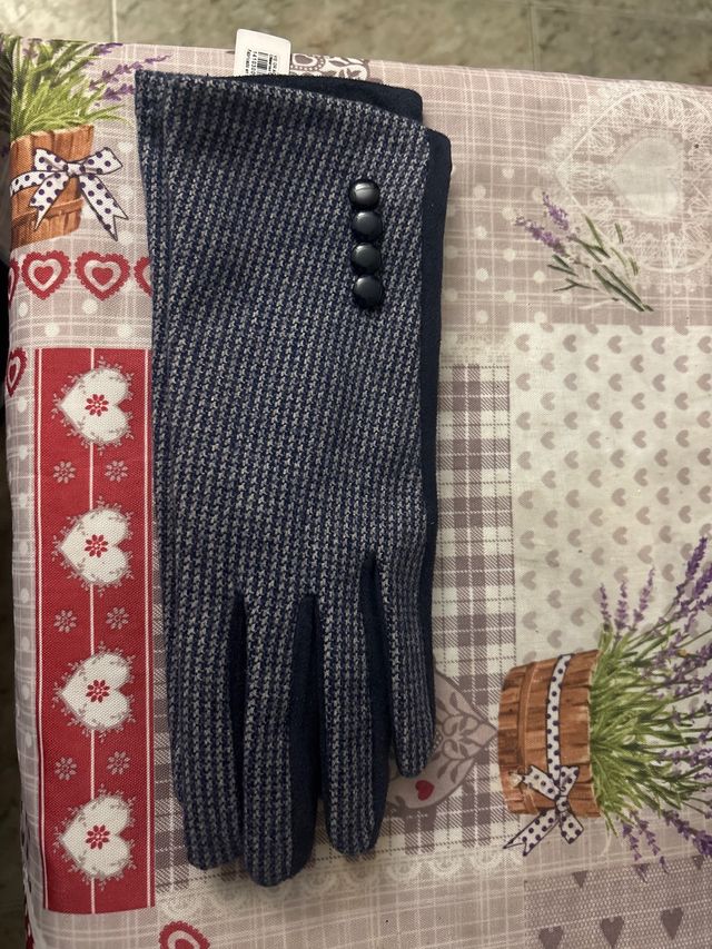 Elegantes guantes con un diseño en tonos azul y gris. Cuentan con cuatro botones decorativos en el lateral.