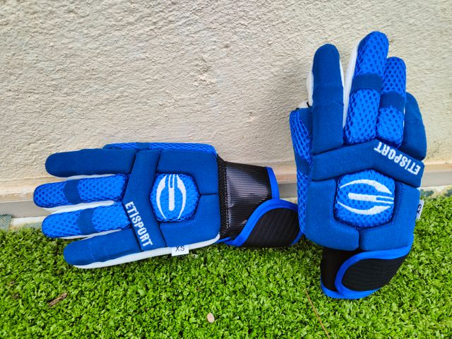 Guantes de hockey Etisport en color azul. Estan nuevos. - Talla XS. - Diseño con malla transpirable. - Cierre de velcro en la muñeca.
