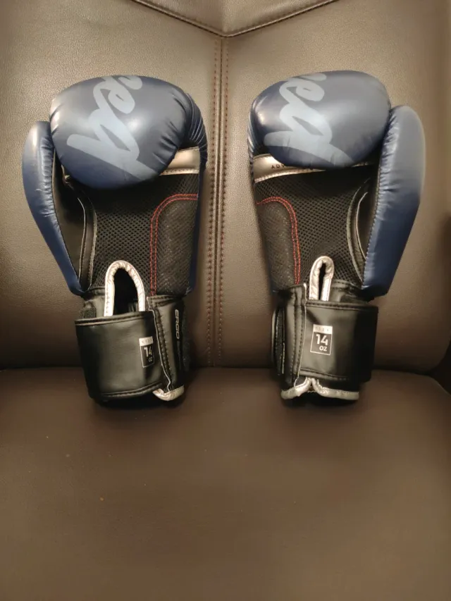 Par de guantes de Muay Thai de 14 onzas, en excelente estado. - Color azul marino. - Cierre de velcro. - Diseño ergonómico.