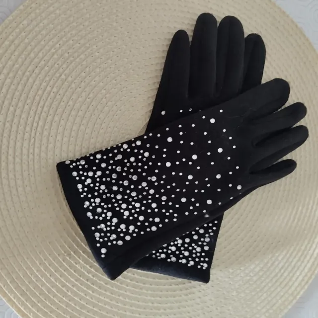 Elegantes guantes negros para mujer, perfectos para el invierno. Cuentan con un diseño adornado con pedrería plateada.