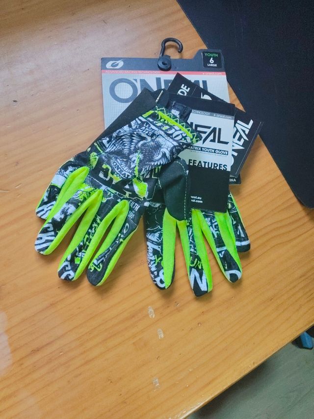 Detalles del productoGuantes de ciclismo ONeal Matrix para jóvenes, talla L. (Aunque yo diría que se corresponde más con una S). Ideales para ciclismo de montaña. Son de color negro, verde lima y blanco, con un diseño llamativo.