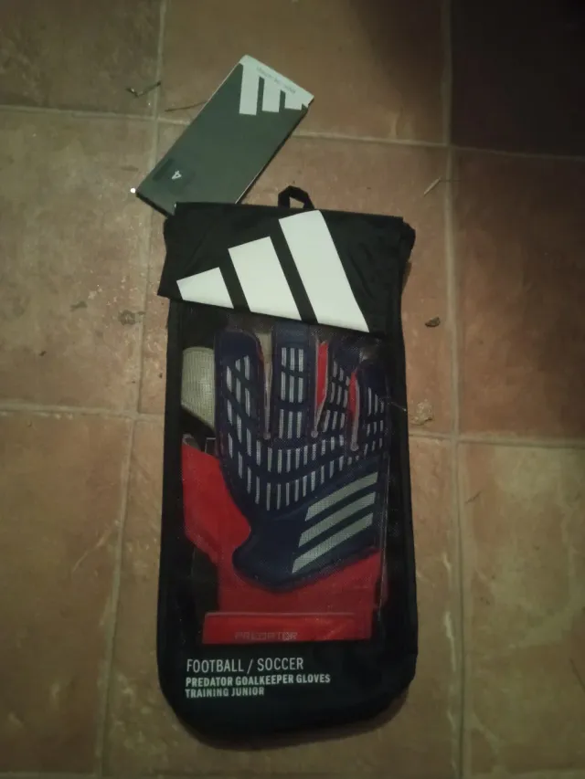 Guantes de portero Adidas Predator para entrenamiento junior. - Talla 4. - Diseño en color rojo y azul. - Incluye bolsa de transporte con logo Adidas.