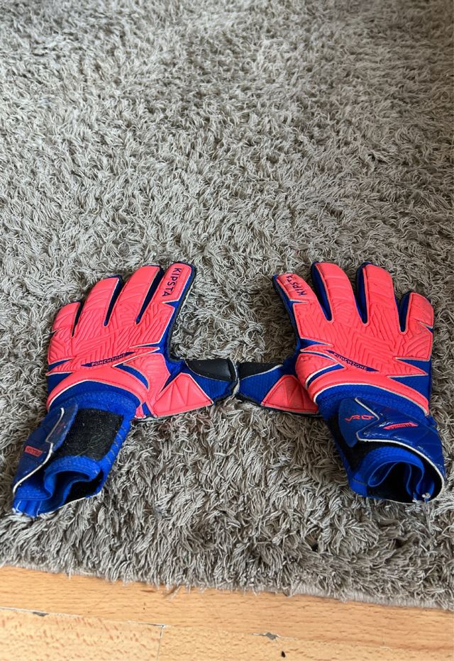 Guantes de portero Kipsta para niños. Diseñados para ofrecer protección y agarre. - Color: Rojo y azul. - Cierre de velcro en la muñeca.