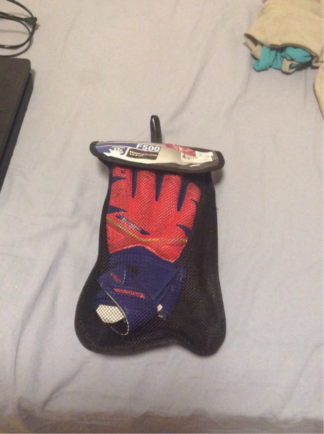 Guantes de portero para niño, modelo F500, con bolsa para guardarlos. - Color rojo y azul. - Bolsa de malla negra.