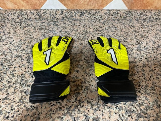 Guantes de portero Rinat Egotiko en color amarillo y negro. - Talla 8. - Diseño con el número 1 en el dorso. - Cierre de velcro en la muñeca.