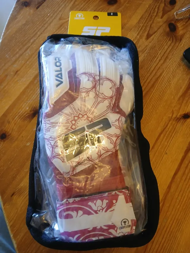 Guantes de portero SP Valor Competition en talla 8. - Diseño en blanco y burdeos con detalles. - Incluyen funda protectora.
