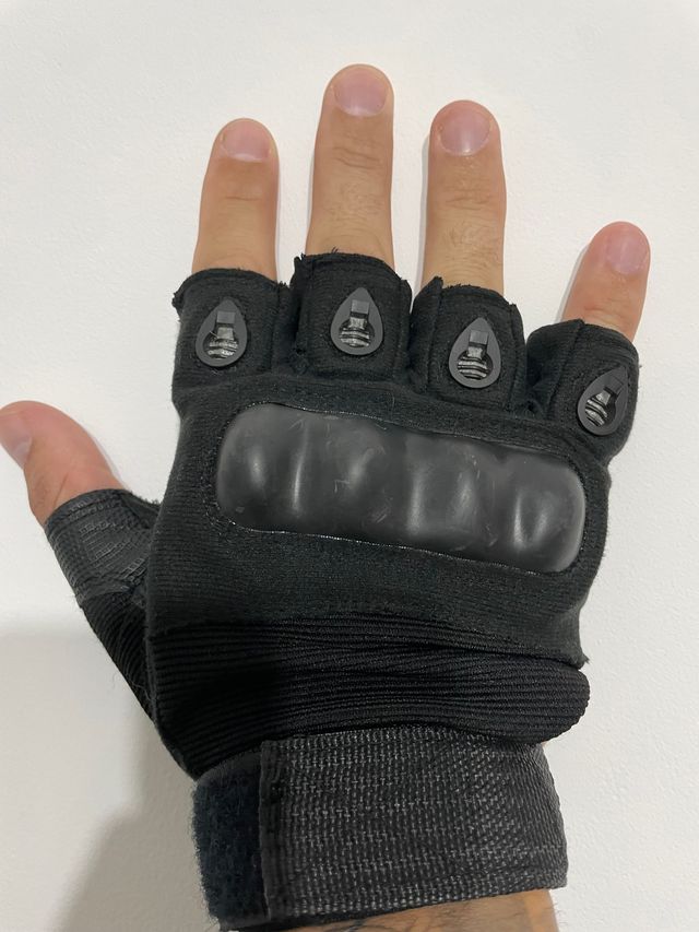 Guantes tácticos unisex con carcasa de plástico protectora para los nudillos. Con almohadillas en la palma y antideslizantes. Para moto, airsoft, fitness, etc Talla L pero bastante justa.