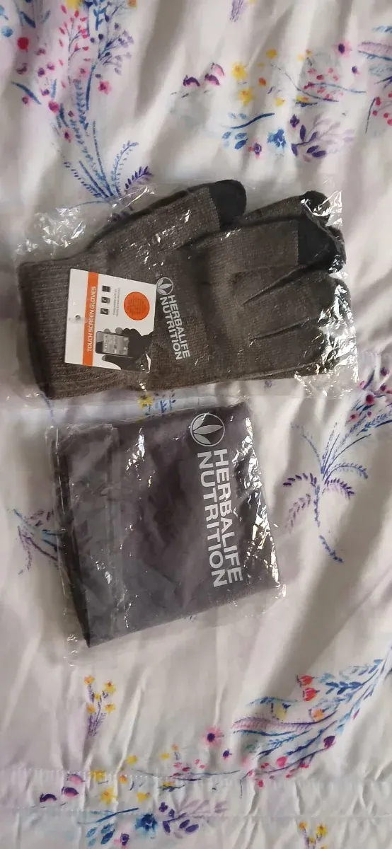 Conjunto de guantes táctiles y braga de la marca Herbalife Nutrition.
