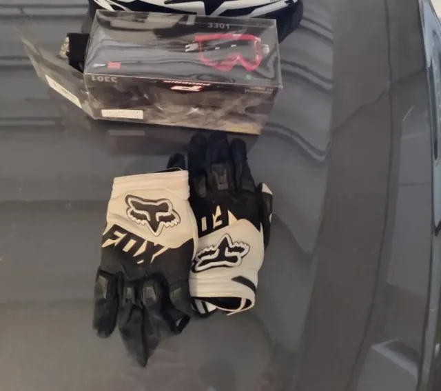 Conjunto de guantes y gafas para quad, moto o similar. El color de los guantes es blanco y negro, con el logo de Fox. - Guantes marca Fox. - Gafas de color rosa.