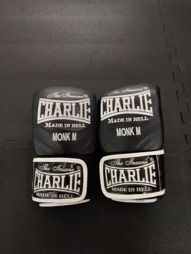 Par de guantillas de boxeo de la marca Charlie. - Modelo: Monk M. - Diseño: Made in Hell. - Color: Negro con detalles blancos.