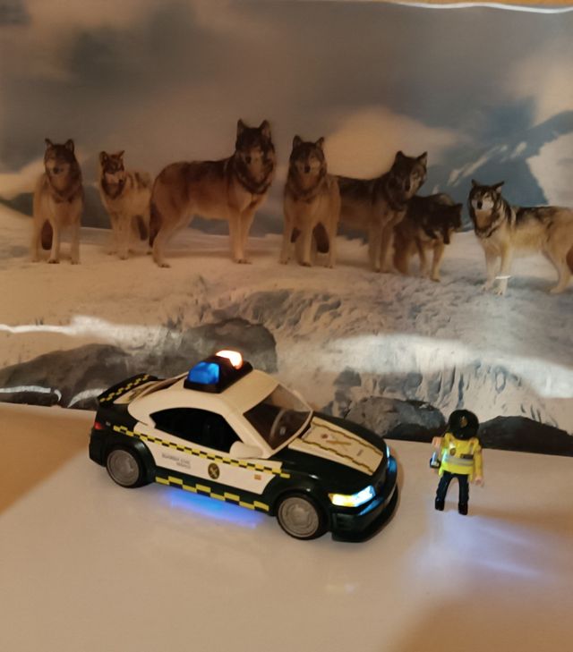 Coche y muñeco de Playmobil caracterizada como de la Guardia Civil de Tráfico .Con luces en los faros,bajo y en la sirena también con sonido. Única.