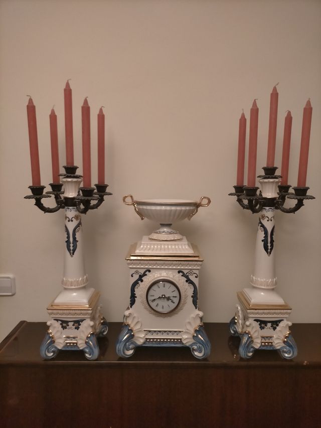 Detalles del productoguarnición de chimenea de cerámica de Pedralba Valencia pintada a mano con policromía de oro. los candelabros tienen 58 cm de alto con una base de 18 x 18 y dónde se enganchan las velas son de bronce con las velas estamos hablando de un total de 82 cm. El reloj tiene 49 cm de alto con una base de 29 x 24. El del conjunto pesa 14 kg.