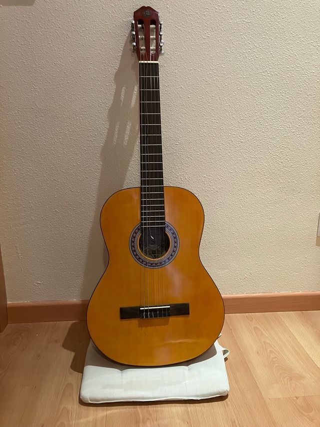 Guitarra española. Tiene una cuerda rota y unos pequeños desconchones que se aprecian en las fotos.