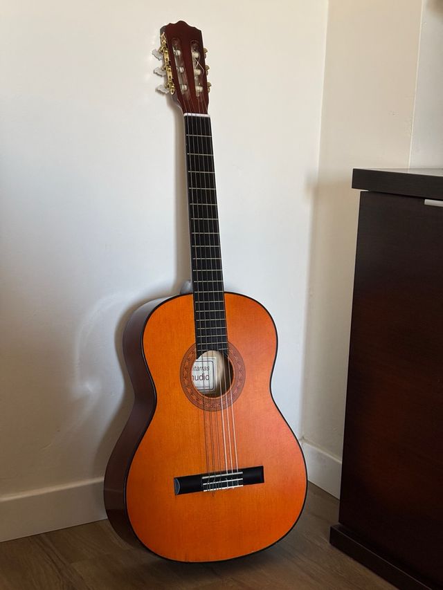 Detalles del productoGuitarra clásica española con un acabado en madera de color naranja Rojiza ideal para iniciación a la Guitarra