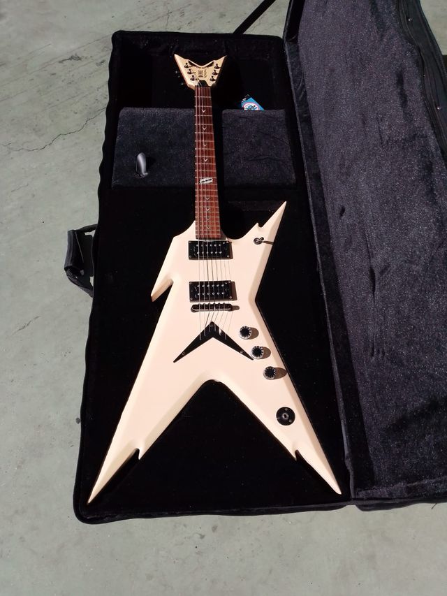 Detalles del productoGuitarra Dean Razorback Dimebag Metallic White con funda blanda.