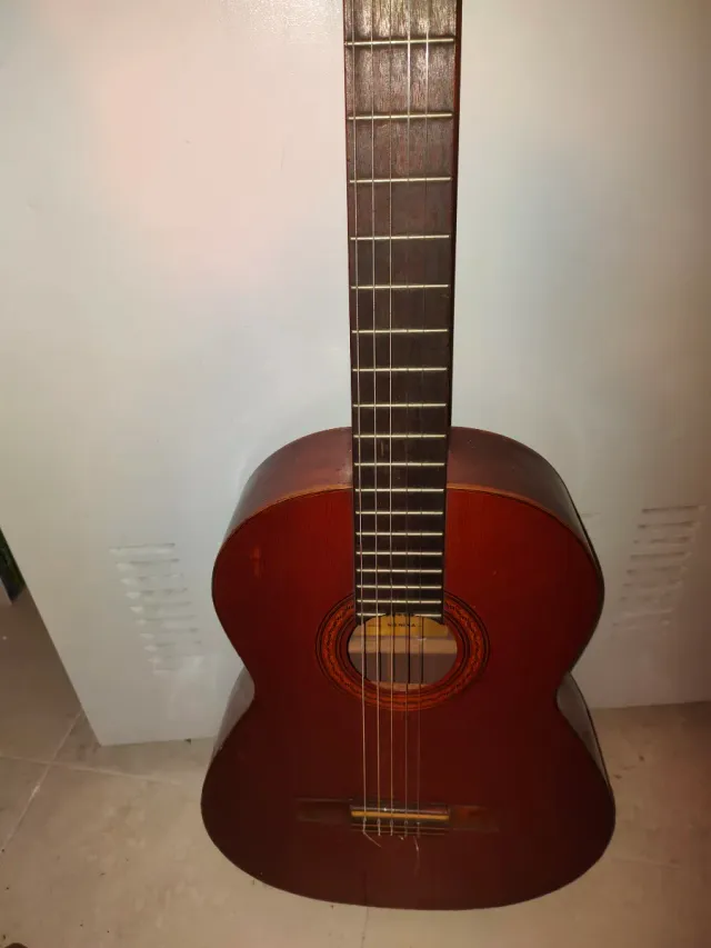 Guitarra española clásica de color marrón. Ideal para principiantes o aficionados. - Cuerpo de madera. - Diapasón con trastes. - Cuerdas de nylon. - Falta una cuerda