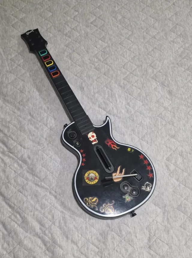 Detalles del productoGuitarra Gibson Les Paul original de Guitar Hero III para PlayStation 3. Es el modelo oficial con frontal negro brillante.