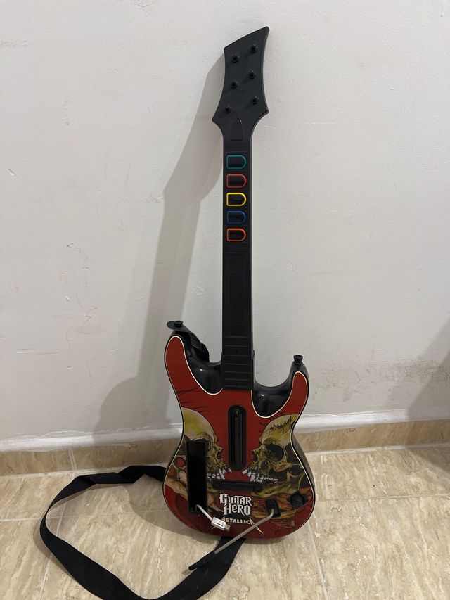 Detalles del productoControlador de guitarra para el videojuego Guitar Hero Metallica en Wii. Presenta un diseño inspirado en el juego con calaveras y detalles en rojo y negro.