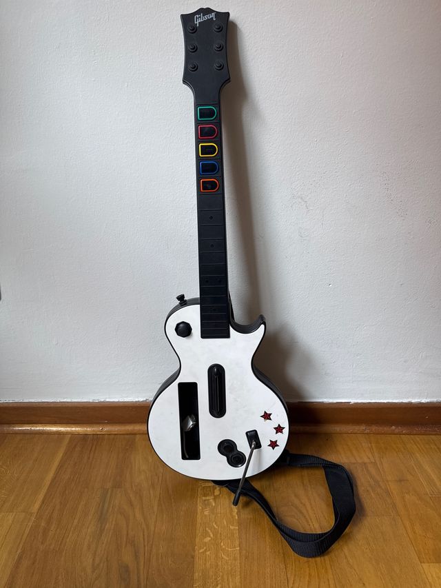 Guitarra de juego para Wii, modelo Gibson. - Diseño inspirado en guitarra eléctrica. - Botones de colores en el mástil. - Incluye correa.