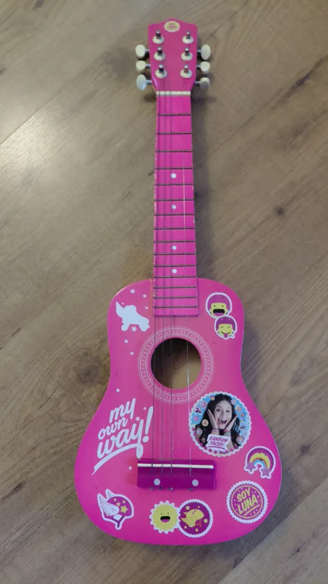Detalles del productoGuitarra infantil de color rosa, decorada con divertidas pegatinas.