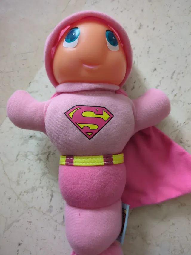 Peluche Gusiluz con temática de Superwoman. - Color rosa. - Diseño de gusano. - Incluye capa. - Símbolo de Superman en el pecho.
