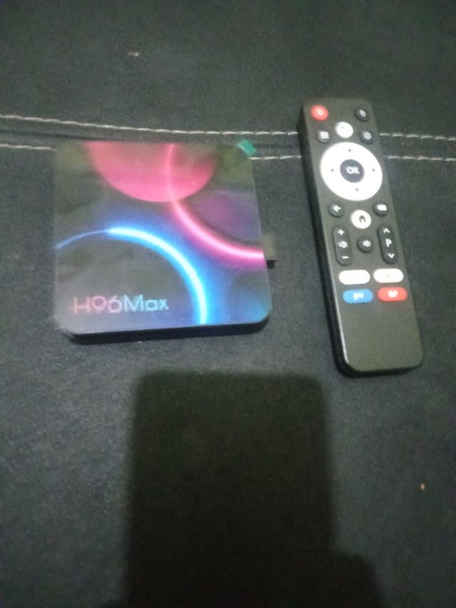 Dispositivo H96Max para convertir tu TV en Smart TV. Incluye mando a distancia. - Diseño moderno con detalles en rosa y azul. - Compacto y fácil de conectar.