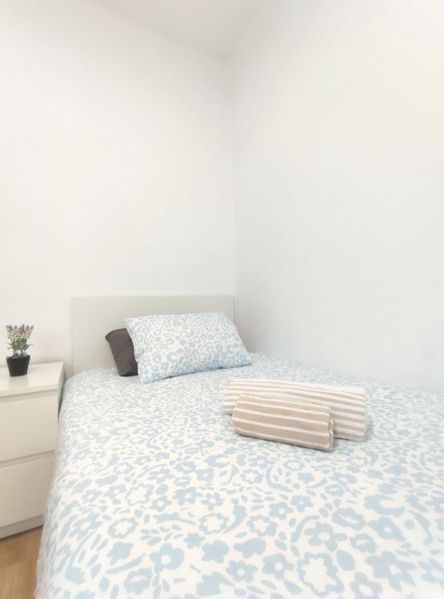 La habitación incluye: cama de 105 cm con colchón y almohada viscoelásticos, armario amplio, 2 cómodas, escriorio con silla y lámpara, edredón, varios juegos de fundas nórdicas, sábanas y toallas. Hay 2 baños completos, cocina equipada y salón independiente. Incluye limpieza semanal.