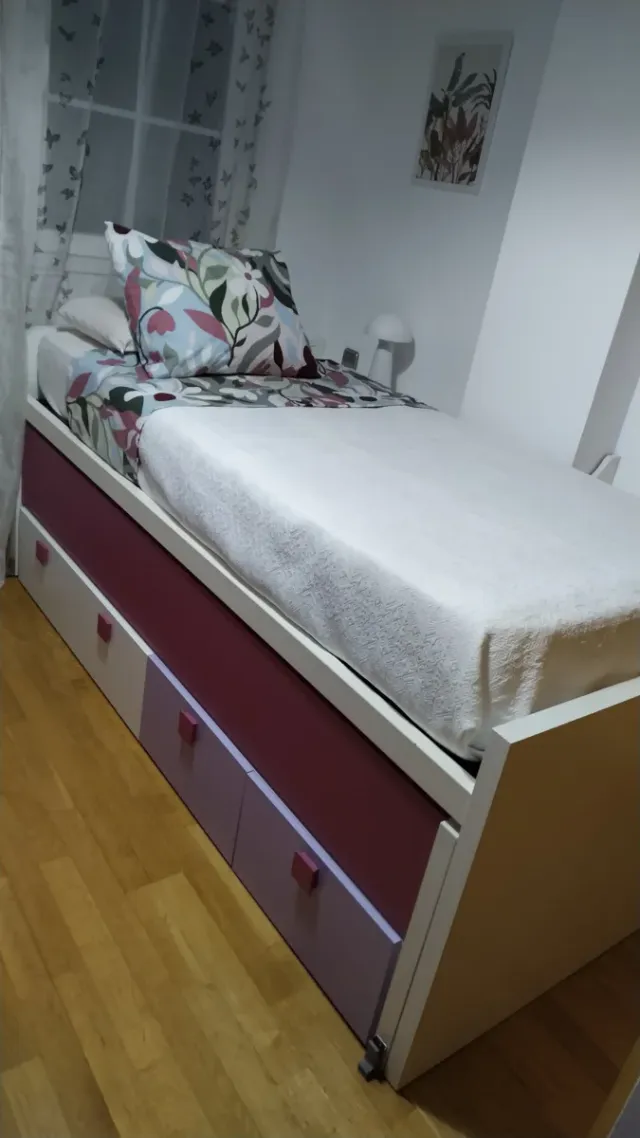 - Conjunto de muebles compuesto de estructura de cama nido con tres cajones de gran capacidad, escritorio y tres módulos de almacenaje.