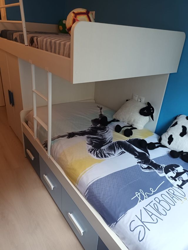 Cama con litera, forma de tren, con 3 cajones debajo de la cama, con raíles extraibles y armario gran con profundidad, igual que las camas 0,90 X 1,19 X 0,90