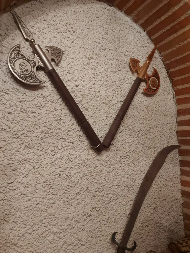 Detalles del productoConjunto de dos hachas decorativas de estilo medieval. Piezas únicas para coleccionistas o decoración.