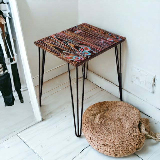 Detalles del productoMesas auxiliares en las que se resaltan las vetas de la madera con colores azul y rosa, creando mezclas de distintas formas y colores. Muy elegante y de estilo moderno. Pueden venir bien en el lateral del salon, salas de espera, mesillas para negocios, bares. Mobiliario artesanal. Hechas de madera de pino y patas metálicas de forja.