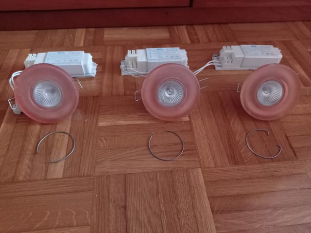 Halógenos de colores (3 unidades azul y 3 unidades salmón): Interior 9 cm y exterior 12 cm