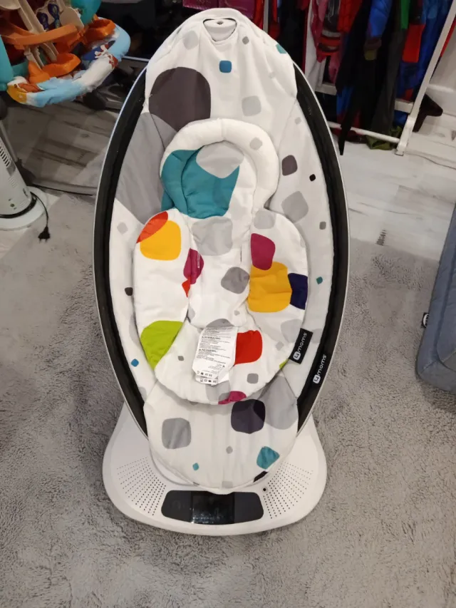 Detalles del productoHamaca para bebés de la marca 4moms. Diseñada con un patrón de puntos de colores sobre fondo blanco. Le falta el móvil de juguete.