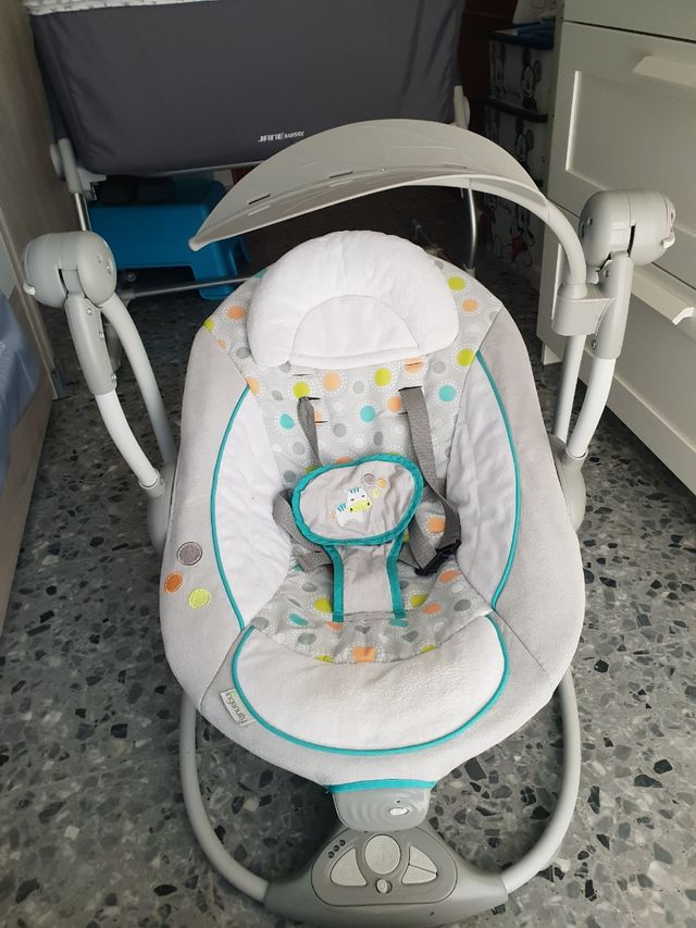 Detalles del productoHamaca/columpio Ingenuity. Uso hasta los 9 kg del bebé. Con varias canciones y sonidos de la naturaleza. Con varias velocidades de balanceo y temporizador. Frenos para poder dejar fijo. Con botón de vibración. Desenfundable para poder lavar en lavadora.