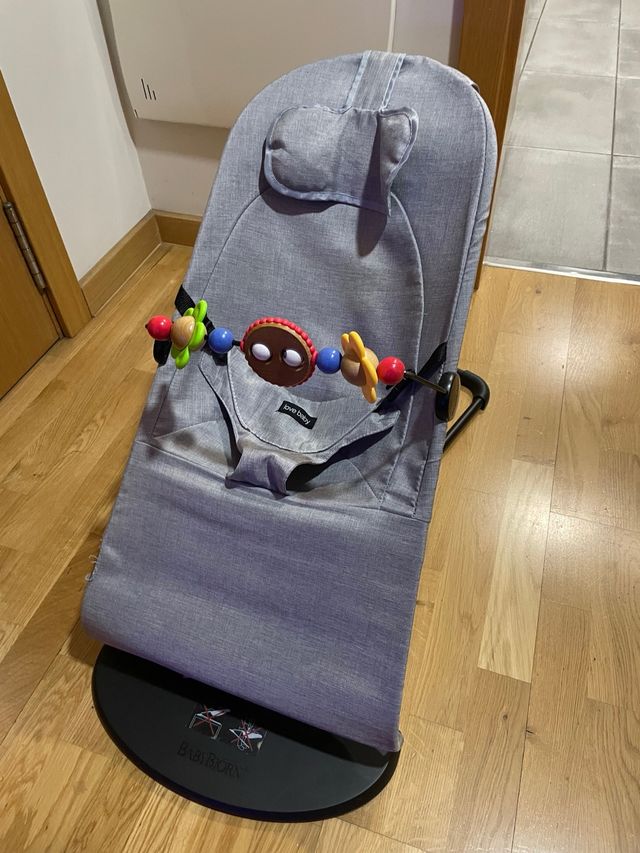 Detalles del productoHamaca para bebés de la marca Babybjörn en color gris. Incluye barra de juegos en madera.