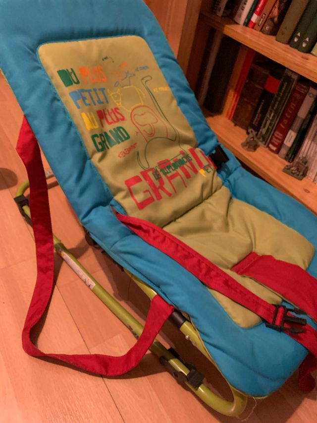 Hamaca para bebes, con diferentes posiciones para el respaldo. La estructura permite que la hamaca se balancee o quede fija en el suelo