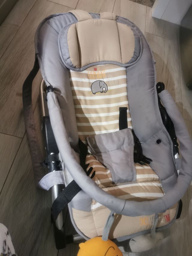 Tiene cojin para la cabeza, tres posiciones de reclinado ,lleva una pata para dejar fija como una silla.