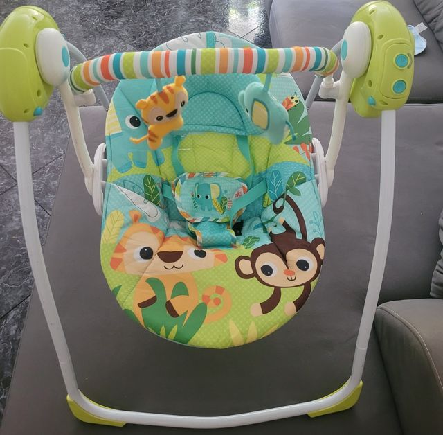 Tiene varios posiciones. Se mece sola con música y varias velocidades. Esta en muy buen estado